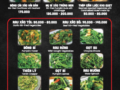 Món Bán Chạy - Best Seller Khai vị - Starter Gỏi - Salad Heo Tộc – Special Pork Gà - Chicken Cá Lăng - Hemibargus Cá Chim Tôm Bò - Beef Heo - Pork Cơm - Rice Các món rau - Vegetables